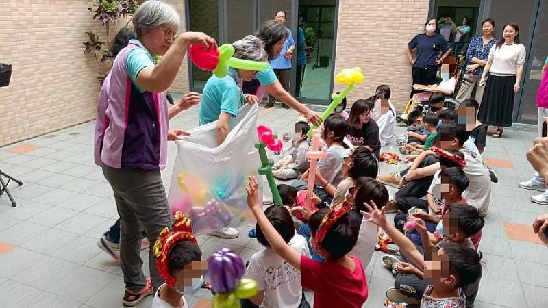 在互動過程中也出現許多自然可愛的畫面,小朋友在嘗試吹氣球時,偶有氣球突然爆破的情形,突如其來的聲響讓陪伴的長輩忍不住驚呼,卻也引來孩子們開懷大笑,形成一幕幕真摯動人的交流瞬間,充分展現世代互動的溫度與純粹情感。