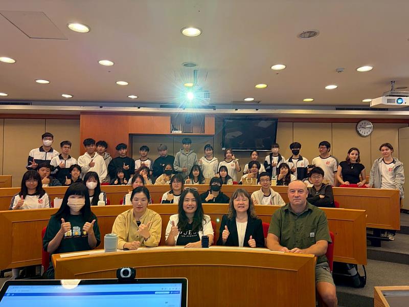 下午的行程則深入各學系的專業領域,展現亞大在實務教學上的特色。經管系蔡碩倉教授以「國際經貿的黑天鵝效應」為題,從台灣視角剖析當前國際政經局勢的機遇與挑戰。他強調,未來競爭關鍵在跨域整合能力,鼓勵學生跳脫課本框架、培養靈活思維。財法系主任莊晏詞則帶領學生進入實習法庭,說明法律與財經知識結合的重要性;她表示,面對數位經濟與AI快速發展的趨勢,跨領域法律人才需求與日俱增,期盼藉此協助高中生確立學習目標。