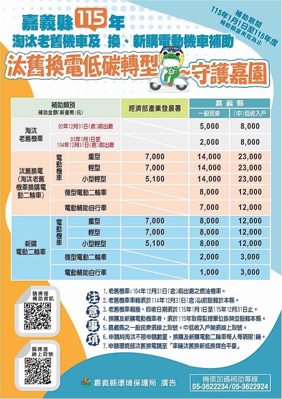 (中央社訊息服務20260413 17:10:50)嘉義縣115年延續辦理淘汰老舊機車、換購及新購電動機車獎勵補助,鼓勵淘汰出廠滿10年以上的老舊機車,若民眾同時換購電動機車,結合經濟部產業發展署補助,最高可省下2萬1,000元,呼籲鄉親把握機會,共同打造低碳「嘉」園。