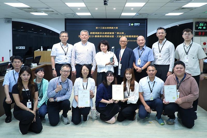 (中央社訊息服務20260414 16:25:57)台灣景觀大獎為具指標性的景觀設計競賽,今年共吸引105件作品參賽,嘉義市政府突破重圍獲「第13屆台灣景觀大獎」3項大獎,奪下「總體規劃及永續經營類」及「公園與公共開放空間類」兩大類別獎項,並4度蟬聯傑出獎項肯定,6年已累計獲得26座獎項,展現市府在城市景觀規劃、永續發展及公共空間營造上的卓越成果。今(14)日,市府獲獎局處於市務會議中轉呈獎項,黃敏惠市長期勉市府團隊持續精進、開創更多佳績。
