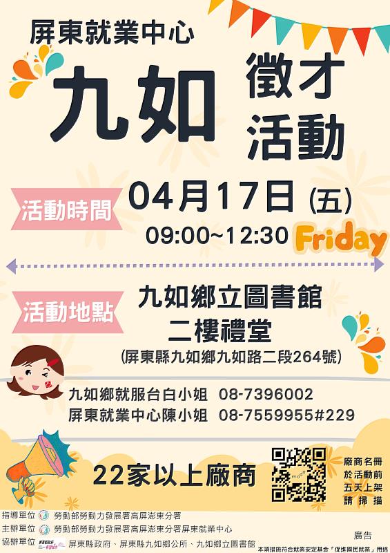 (中央社訊息服務20260414 17:26:43)為促進地方就業並協助民眾在地銜接職場,勞動部勞動力發展署高屏澎東分署屏東就業中心將於115年4月17日(星期五)上午9時至12時30分,在九如鄉立圖書館2樓禮堂舉辦現場徵才活動。本次活動特別邀集25家友善企業共同參與,釋出超過295個多元職缺,涵蓋製造業、電子工業、建築業及服務業等領域,打造便捷且高效的在地就業媒合平台,協助九如地區及周邊鄉鎮民眾就近求職。