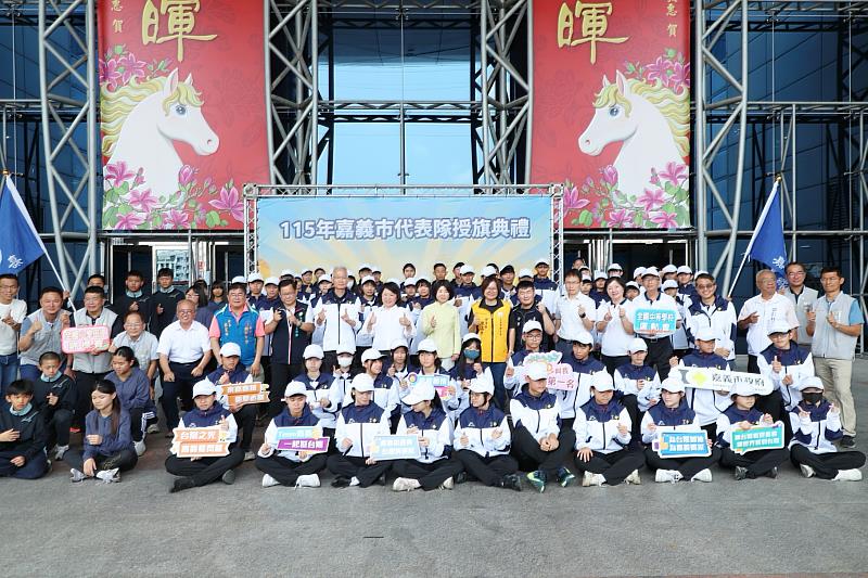(中央社訊息服務20260415 14:00:09)嘉義市政府今(15)日舉行「115年全國中等學校運動會暨全國小學田徑錦標賽」聯合授旗典禮,由黃敏惠市長授旗予嘉義家職角力常勝軍湯昔恩選手及田徑小將宣信國小林欣妤選手,象徵嘉義市代表隊正式出征,全力挑戰全國中小學最高競技殿堂。黃敏惠市長致贈每位選手加菜金與慰勞水果,為選手們注入滿滿能量,期勉大家以最佳狀態迎戰,勇敢追夢、再創巔峰。