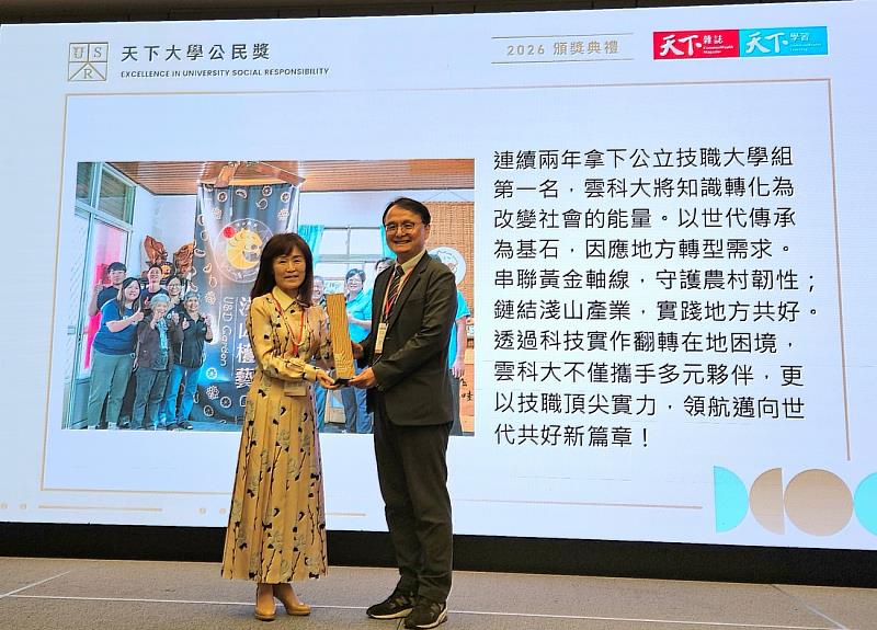 (中央社訊息服務20260415 16:21:13)雲科大參與《天下雜誌》主辦之「2026年天下大學公民獎」,蟬聯公立技職大學第1名,再創佳績,頒獎典禮於4月15日在台北國泰萬怡酒店舉行。該獎項歷經資料填報、指標評比及評審團面審等多重評選機制,雲科大憑藉長期深耕在地的成果,獲得評審高度肯定,展現大學社會責任USR的卓越實踐力。