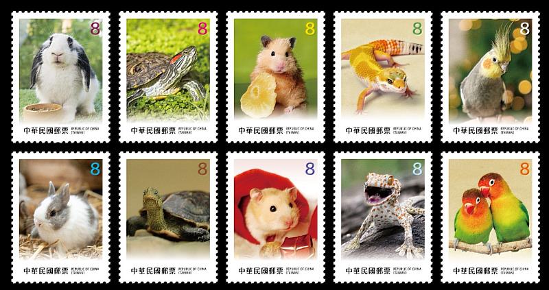 郵票圖案以廣受民眾喜愛的小型寵物為主角,包含溫馴可人的兔子、吉祥長壽的烏龜、靈巧逗趣的倉鼠、獨具魅力的守宮及羽色華麗的鸚鵡。千姿百態的萌寵不僅給予家人溫馨的陪伴,更帶來歡笑與感動。