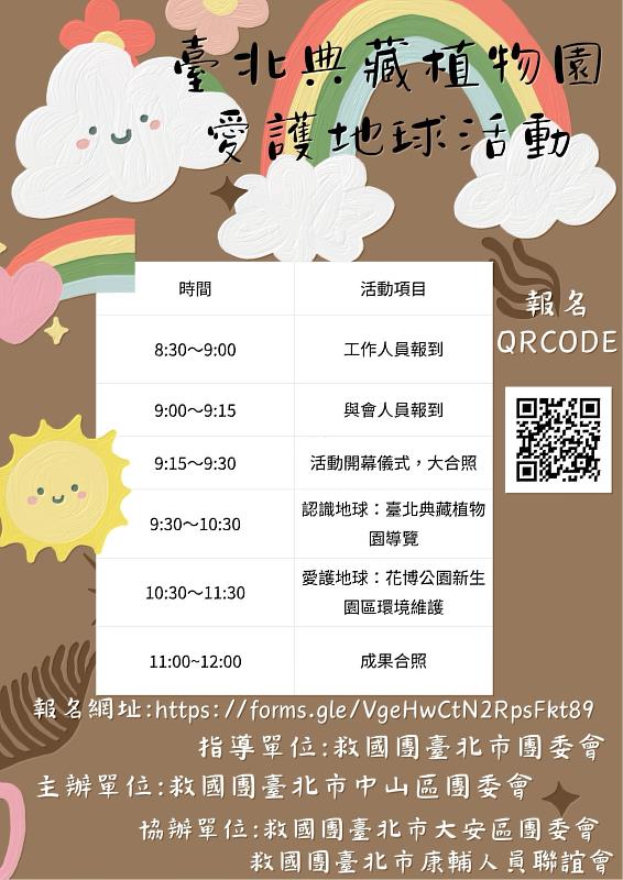 為響應每年422世界地球日,發揮愛護地球與關懷環境的精神,救國團臺北市中山區團委會於4月19日(星期日)上午號召救國團夥伴邀集親友,一起到臺北市花博公園新生園區,舉辦「認識地球愛護地球公益活動」,透過實際行動為我們居住城市的環境發揮貢獻。