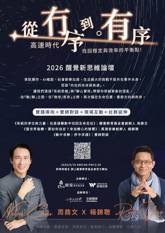 (中央社訊息服務20260416 12:05:31)根據2026年社群趨勢觀察,職場熱門關鍵字已從「如何使用AI」轉向「如何擺脫AI帶來的焦慮」。當AI算力以幾何倍數成長,人類的心理承載力是否已達極限?面對這股無形的浪潮,醒覺教育基金會將於5月16日舉辦「醒覺新思維論壇」,邀請兩位在身心領域深耕多年的重量級導師-國際系統排列專家周鼎文與風潮音樂創辦人楊錦聰,分享如何透過「系統思維」與「動態靜心」,建立面對變局的內在穩定力。