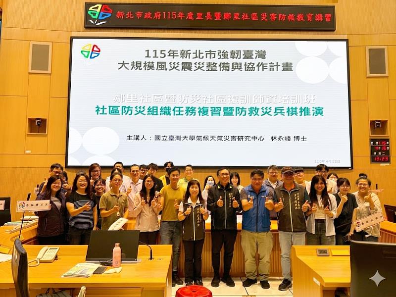 (中央社訊息服務20260416 17:18:11)為強化新北巿里長、巿民災害防救知能與行動力,新北巿政府4月15日於巿府大樓9樓災害應變中心,辦理115年度里長暨鄰里社區災害防救教育講習第1階段的師資培訓,召集29區災害防救業務相關人員參與,由協力團隊國立臺灣大學氣候天氣災害研究中心規劃訓練。培訓完成後,再各區公所針對轄區里長、防災(韌性)社區及里民辦理講習訓練。