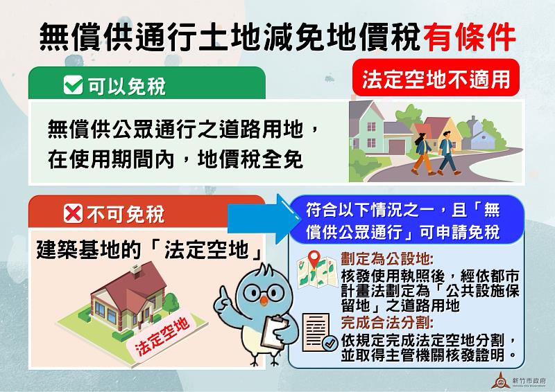 (中央社訊息服務20260417 10:46:02)自家土地若長期無償供鄰里通行,地價稅有機會免徵!新竹市稅務局表示,無償供公眾通行的道路土地,經查明屬實者,在使用期間內可申請免徵地價稅,但若該土地屬《建築法》規定應保留的「法定空地」,則無免徵的適用,請市民朋友多加留意。