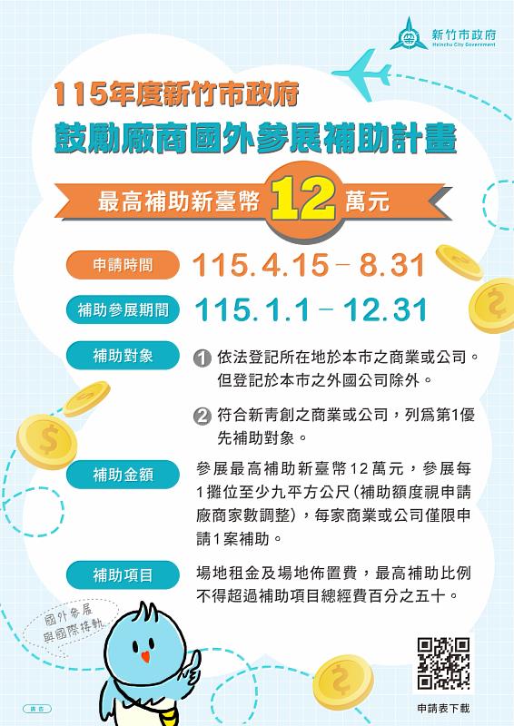 (中央社訊息服務20260420 14:12:51)面對全球市場快速變動與供應鏈重組趨勢,企業強化國際布局已刻不容緩。新竹市政府今(115)年擴大推動「國外參展補助計畫」,每家廠商最高補助新臺幣12萬元,補助項目涵蓋場地租金及場地佈置費,協助企業降低拓展海外市場成本。市長高虹安表示,市府將持續做企業最堅實的後盾,支持在地廠商與新創團隊勇敢走向國際,提升品牌能見度並爭取海外商機。