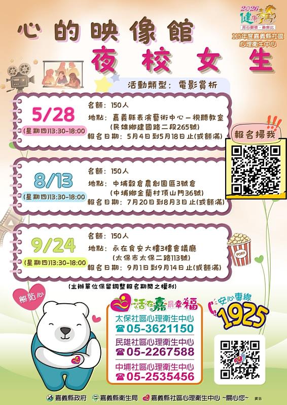 活動相關資訊可電洽嘉義縣社區心理衛生中心05-3621150詢問,或洽詢嘉義縣社區心理衛生中心臉書,歡迎民眾透過QR Code及下列網址報名https://www.beclass.com/rid=3052582699ff02a9c6fe。