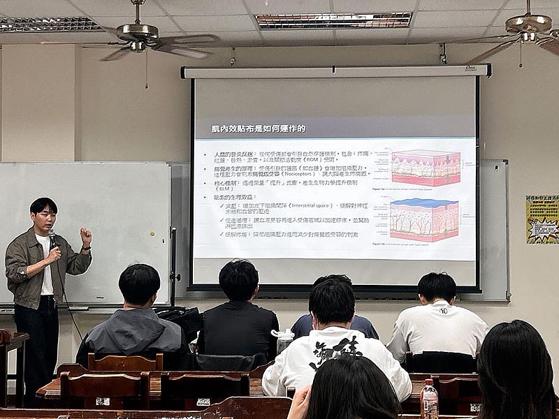 (中央社訊息服務20260423 15:24:26)南華大學為提升師生運動防護與健康照護能力,於日前舉辦「痛痛Bye Bye!貼紮神技實戰課」實作課程,透過專業講解與實際操作,引導師生體驗肌內效貼紮技術,從基礎認識到動手實際操作、練習,現場互動熱絡,大家皆收穫滿滿。