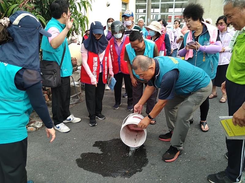 夏季為病媒蚊孳生高峰期,活動出發前由防疫人員進行防蚊滅孒教學,提升長者對登革熱防治的正確認知,並由龍江里里長及鎮民代表共同示範「巡、倒、清、刷」防蚊4招,沿路由滅蚊志工與據點長輩化身防疫尖兵,一邊健走運動,發現路邊有丟棄飲料瓶、住家屋前花盆水桶等積水容器孳生孒孓,還有菜園也有屯水容器,現場除立即清除倒掉,也衛教民眾住家屯積水要加蓋或網紗等防治措施,以防範孳生病媒蚊。