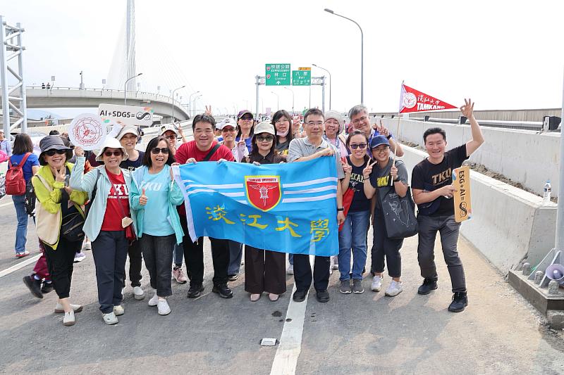除了專業技術的支援,淡江師生更積極參與地方重要慶典。在4月17日由淡水與八里區公所主辦的「淡水八里.橋見未來」通車系列活動中,馬雨沛秘書長與蕭瑞祥總務長偕同逾20位同仁共襄盛舉,與萬名鄉親一同走上這座由國際知名建築師札哈.哈蒂(Zaha Hadid)團隊設計的流線型地標。而建築系後續將舉辦系列演講,邀請Zaha Hadid設計團隊及相關工程營造單位的校友蒞校,分享大型公共建設從設計到施工的實務經驗。