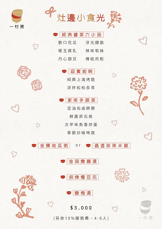 秉持淳樸簡單就是美好滋味的「一村粥」,不僅以樸實真摯的方式呈現食材原味,更將食材精華融入主廚悉心烹調的每一道小菜中,絕對是長輩心中的養生首選。為了讓不同規模的家庭都能享受天倫之樂,一村粥特別規劃了兩款精緻桌菜: