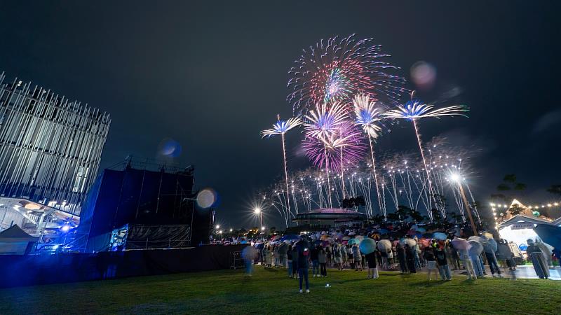 晚間登場的煙火與無人機展演大秀「光有回聲」,依循音樂節奏精密編排,打造「天空雙舞台」的立體展演形式。超過2,500發的煙火,透過高、中、低空層次配置,以五色瀑布型與落葉型花色為主軸,呈現流動且富層次的視覺效果;無人機編排出美術館外觀、金牛角及三鶯線列車等動態圖像,透過光影交織,呈現具有情感深度與象徵意義的夜空藝術饗宴。