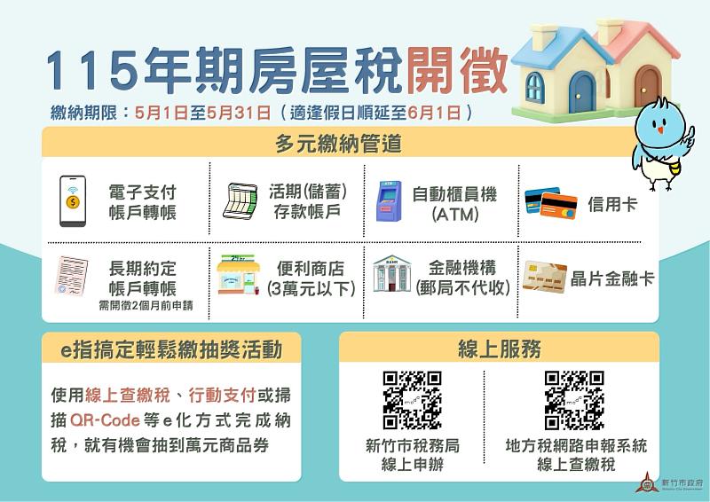 (中央社訊息服務20260427 10:25:57)115年期房屋稅將於5月1日開徵,繳納期限至5月31日,因適逢假日順延至6月1日。新竹市稅務局表示,稅單及轉帳繳納通知書已於4月22日全面寄發,提醒民眾留意繳納期限;另為鼓勵使用e化繳稅,推出「e指搞定輕鬆繳抽獎活動」,凡透過線上查繳稅、行動支付或掃描QR Code等方式完成繳納,即有機會抽中1萬元商品券,邀請民眾踴躍參加。