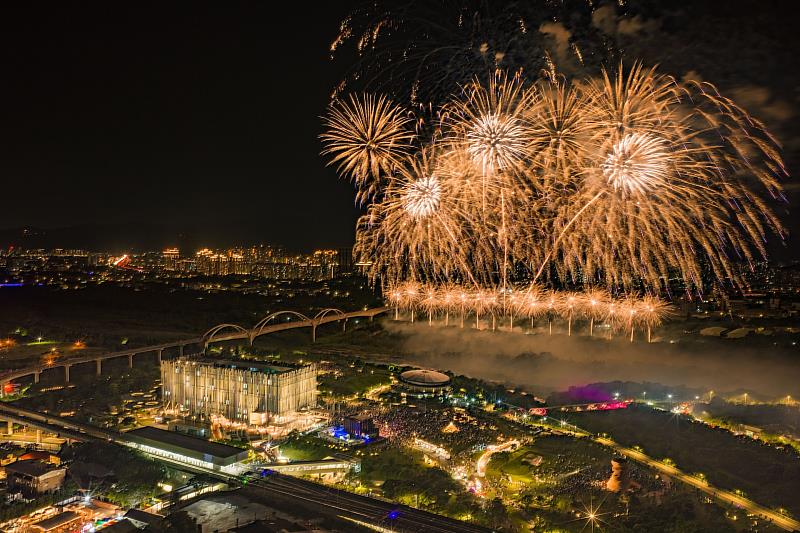 晚間8點40分登場的煙火與無人機展演「光有回聲」,整合煙火與無人機進行空中同步展演,依循音樂節奏精密編排,打造「天空雙舞台」的立體展演形式。超過2,500發的煙火,透過高、中、低空層次配置,以五色瀑布型與落葉型花色為主軸,呈現流動且富層次的視覺效果;300架無人機,編排出美術館外觀、金牛角及三鶯線列車等動態圖像,透過光影交織,呈現具有情感深度與象徵意義的夜空藝術饗宴。