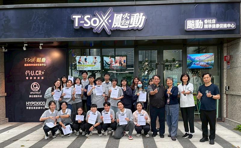 隨後師生前往「T-SoX飈動健康促進中心」香社店,進一步體驗AI體態檢測與數位重訓。學生透過影像分析獲得骨架排列、肌肉分布、姿勢偏移與體態風險報告,並在教練帶領下進行上肢與下肢肌力測試,了解數位化阻力訓練如何透過角速度、重量、1RM估算與組數紀錄,建立更精準且安全的訓練處方。