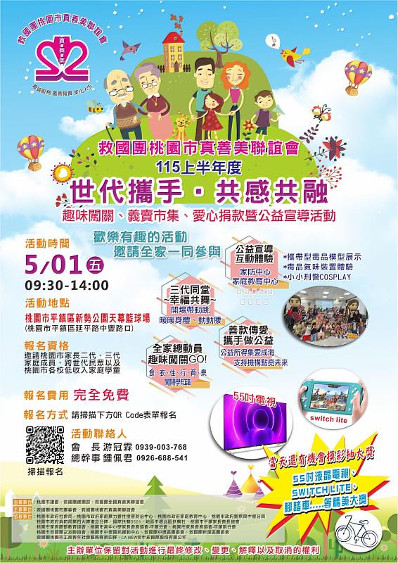 在忙碌的數位時代,螢幕往往取代了面對面的溝通。為鼓勵民眾放下手機、回歸家庭,救國團桃園市真善美聯誼會將於115年5月1日上午9時30分在平鎮新勢公園天幕籃球場舉辦「世代攜手.共感共融」公益活動。活動結合了專業劇場、生活闖關與反毒教育,期盼在五一勞動節這天,帶領桃園市民找回家庭成員間最純粹、最溫暖的陪伴。
