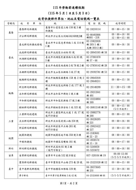 (中央社訊息服務20260428 10:34:15)115年5月1日至5月3日勞動節連續假期,各地郵局營業窗口僅臺北故宮郵局營業,提供外幣兌換、各類集郵票品與代售商品販售服務,其餘郵局一律停止營業。