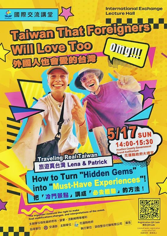 (中央社訊息服務20260424 17:08:55)The first session of the Hualien County Government’s 2026 “International Exchange Lecture Series” will be held at 2:00 p.m. on Sunday, May 17, at the county government auditorium. The event features Lena and Patrick from the popular YouTube travel channel “Travel North Taiwan” as guest speakers. Their presentation, titled “Taiwan That Foreigners Will Love Too: How to Turn Hidden Gems into Must-Have Experiences,” will explore strategies for marketing lesser-known destinations to international travelers. Anyone interested in promoting Hualien tourism and appealing to independent global travelers is highly encouraged to attend.