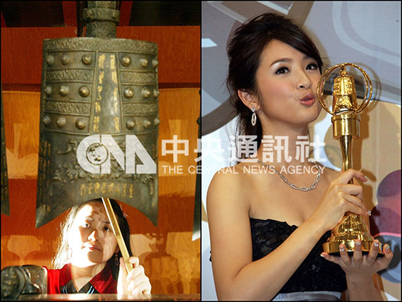 藝人林依晨手中捧的金鐘獎獎座,其造型設計靈感來自「編鐘」(左)。(中央社檔案照片)