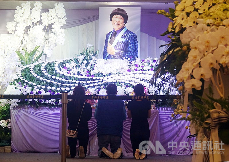 「秀場天王」豬哥亮5月15日因大腸癌病逝,享壽70歲,長眠於基隆擁恆文創園區,並設立豬哥亮紀念園區。圖為豬哥亮女兒謝金晶(左起)、兒子謝順福與兒媳在靈堂祭拜。中央社記者施宗暉攝 106年5月16日