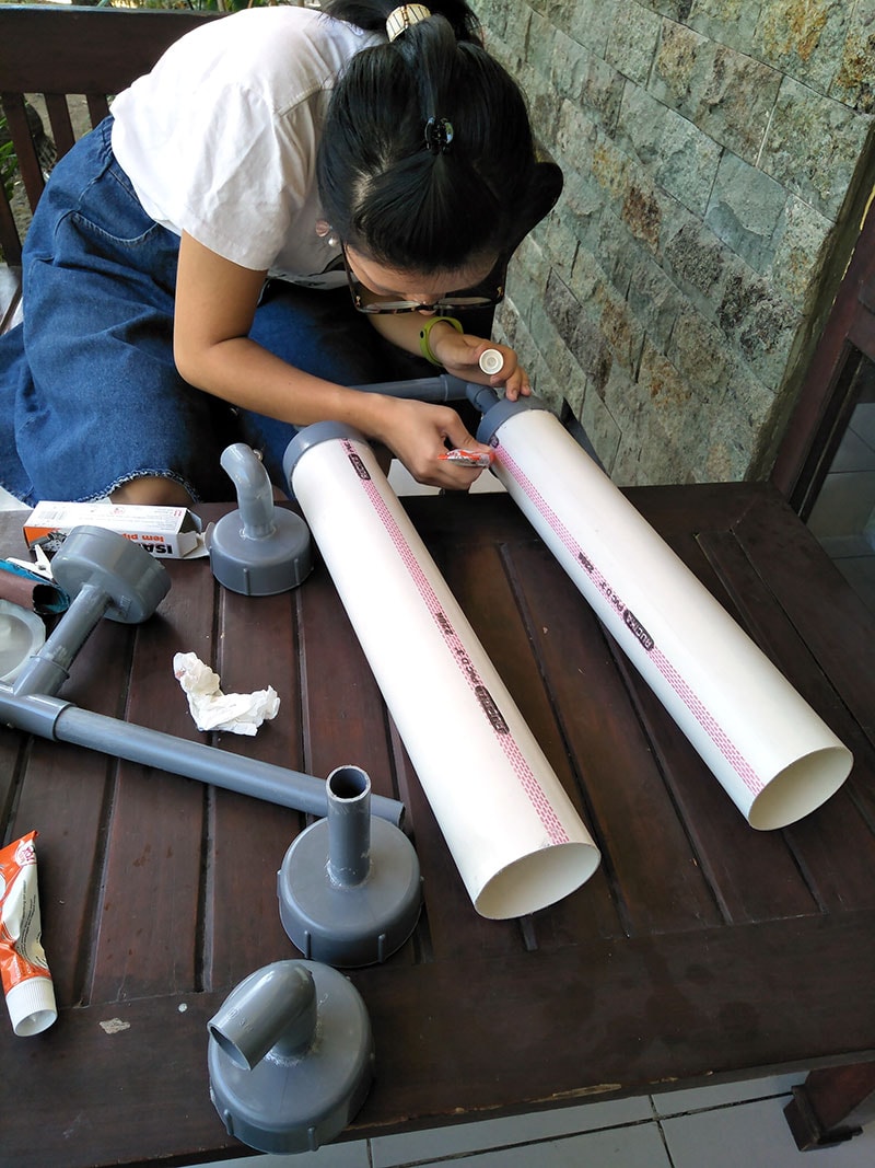 另一組團隊前往靠內陸的偏遠村莊,由於當地去年一整年只下了4天雨,因此協助建置灌溉系統是首要任務。台科大化工系四年級學生吳旻臻等人和就讀電機系的印尼大學生合作,先在學校先搭好灌溉系統,再運送至村莊安置。