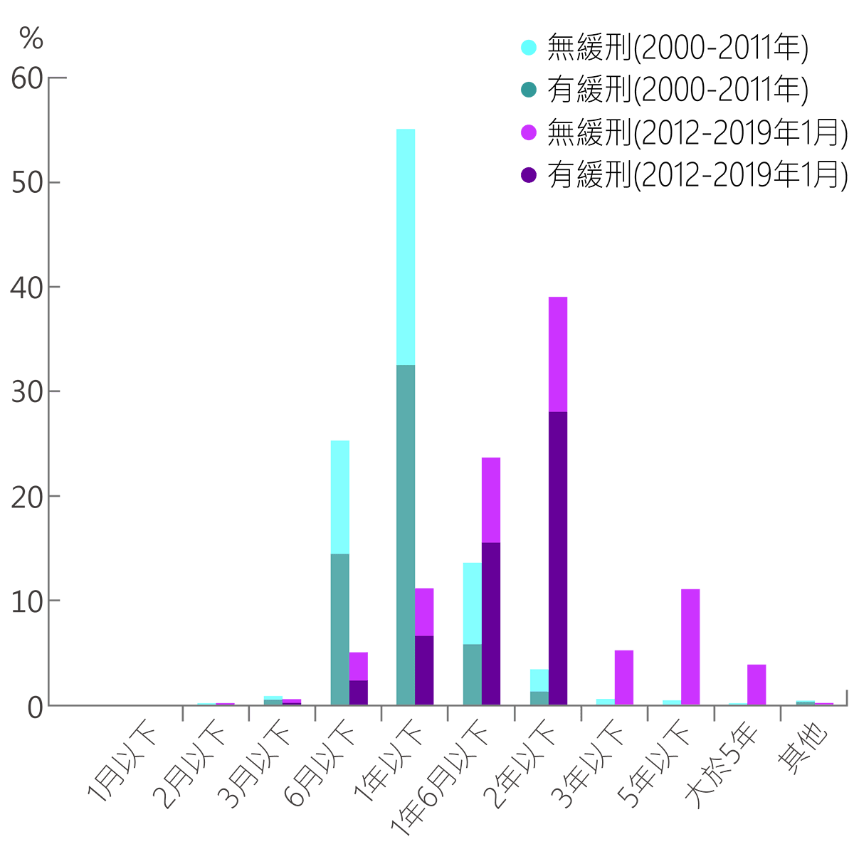把刑期以2011年修法前後來切分,雖然可以看到刑期明顯提升,但修法後的刑期仍有近8成為兩年以下,其中約有半數獲得緩刑註。法官這麼判決的考量會是什麼?
