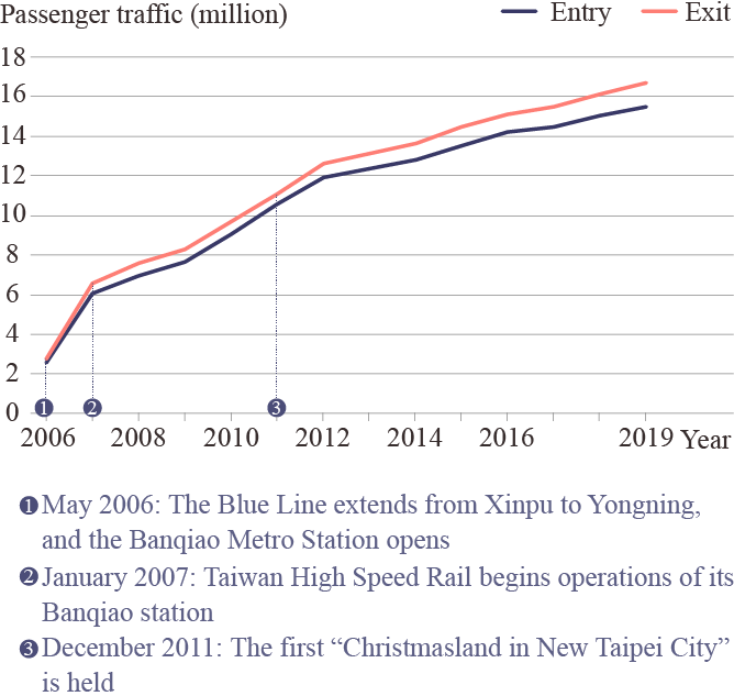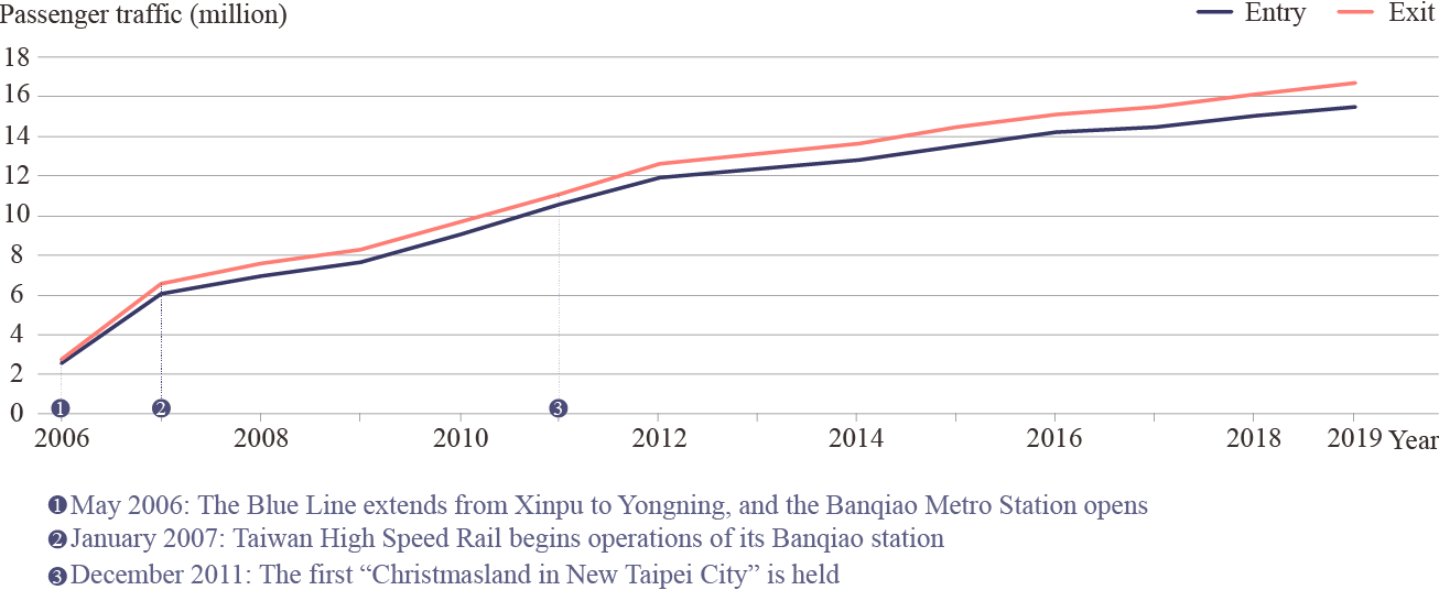 One oddity in the statistics is the growing gap between the number of passengers entering and exiting the Banqiao metro station since it opened in 2006. In 2019, 1.21 million more passengers exited the metro station than entered it, about 3,327 people every day who arrive in Banqiao by the subway and use other means of transportation when leaving the area. Taipei Metro believes this is a result of other transportation options as well as the shopping and entertainment venues available in the area.