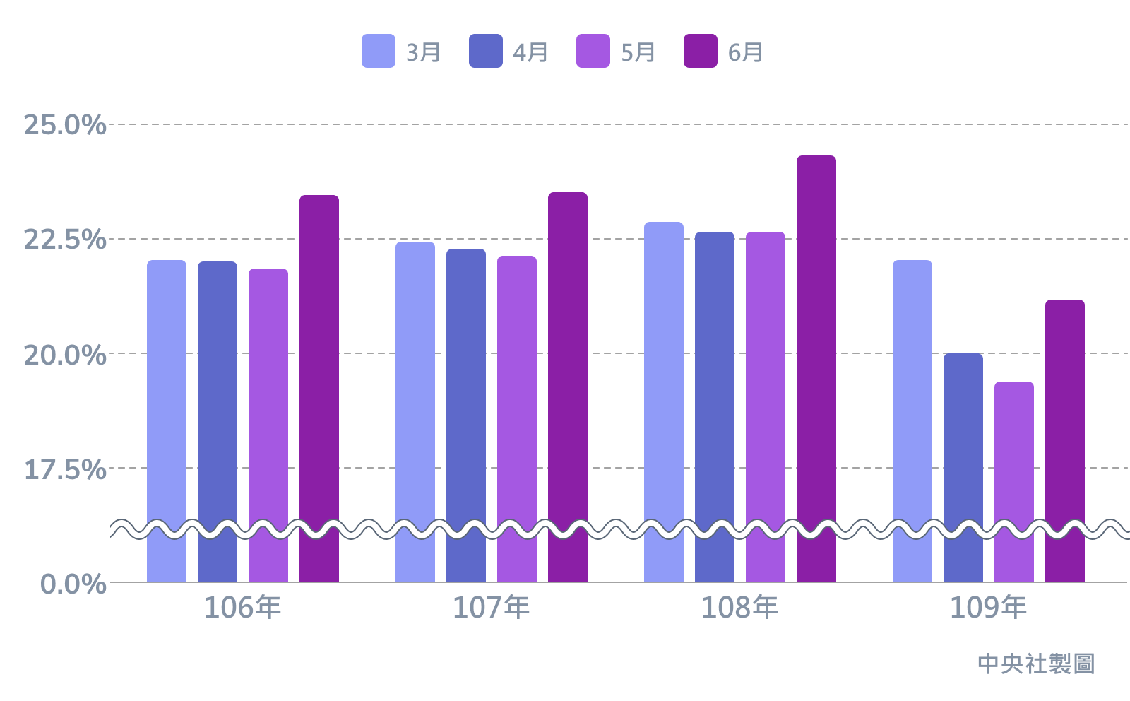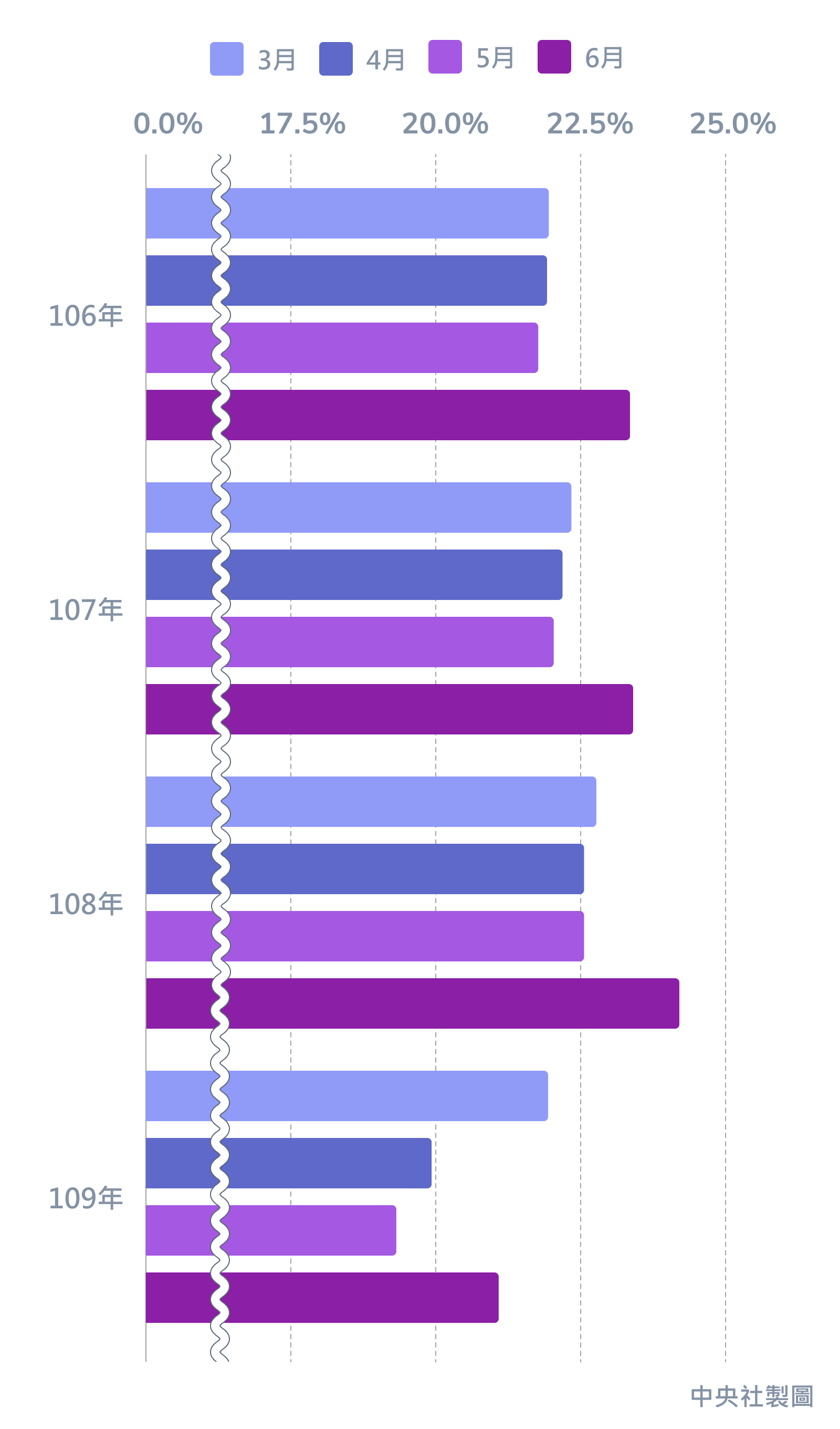 我們來看看「初次尋職者」占所有失業者的比例。從上圖可以看出,106年至108年每到6月畢業生投入職場,初次尋職者占比都會上升。但是109年3月至6月初次尋職者比例比前幾年低,6月畢業生求職季,初次尋職者的比例反而低於3月,顯示今年投入職場的新鮮人比往年少。