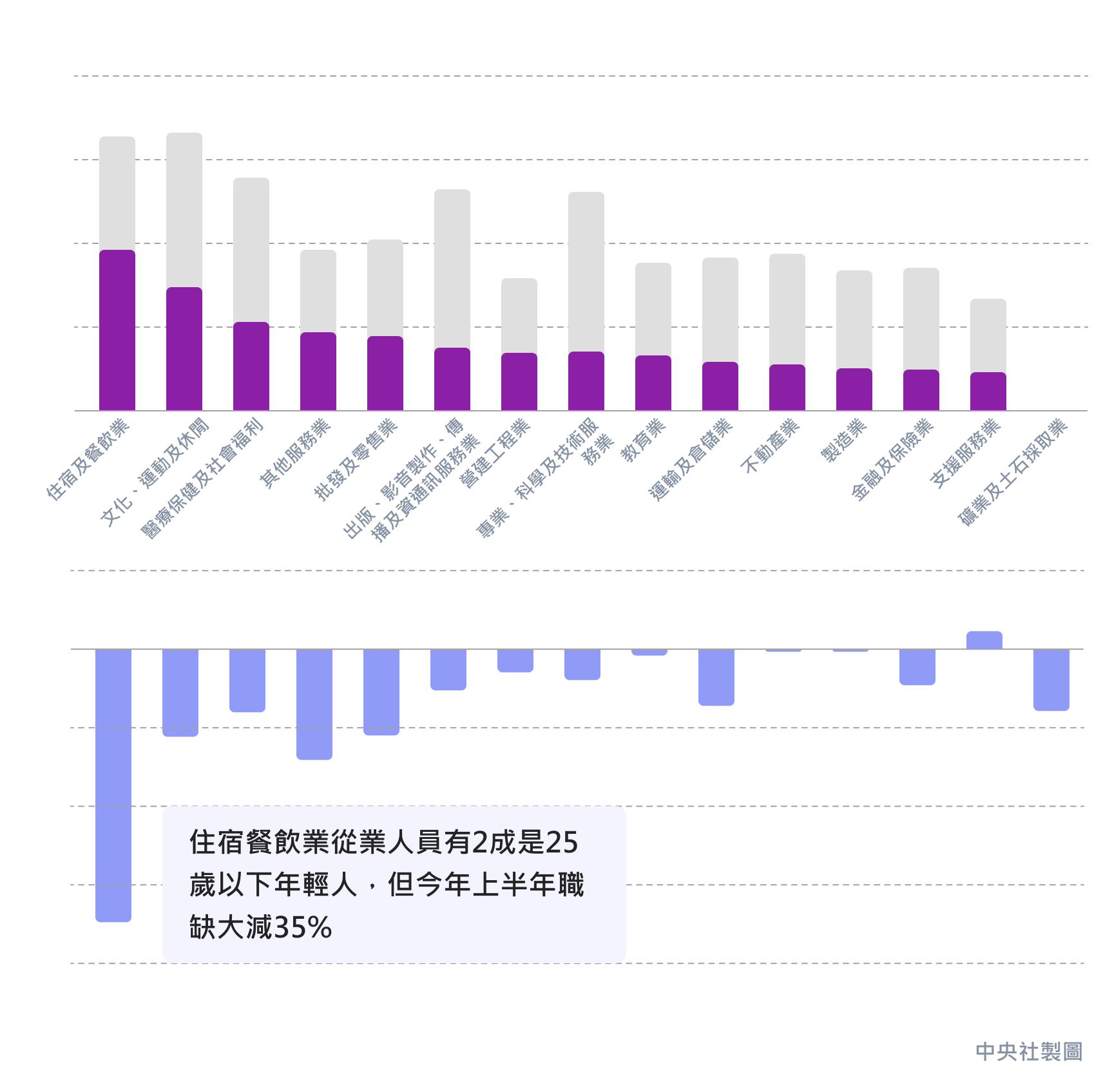 幾乎所有產業今年上半年開出的職缺數都比去年上半年少,但是未滿25歲青年就業占比較高的產業類別特別嚴重。例如住宿及餐飲業有2成就業人口是未滿25歲的青年,今年上半年職缺比去年同期大減35%,少了6800個職缺。