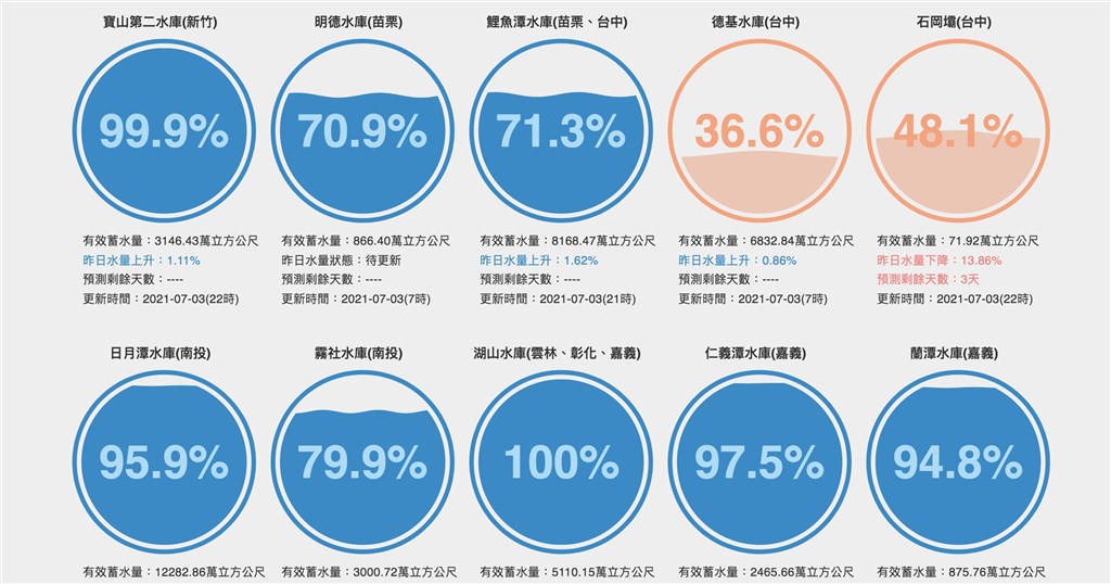 直到6月,才靠著彩雲颱風及幾波梅雨鋒面降雨,讓主要水庫蓄水率逐步回到兩位數。短短幾週,全台水庫水量進帳逾2億噸,一下雨,就有數千人湧入石門水庫網站觀看大壩降雨直播畫面,焦急溢於言表。限水又逢COVID-19疫情升級,儲水苦撐的中部民眾終於盼到解除限水,甚至直呼終於可以放心沖馬桶了。