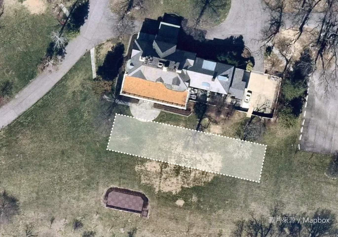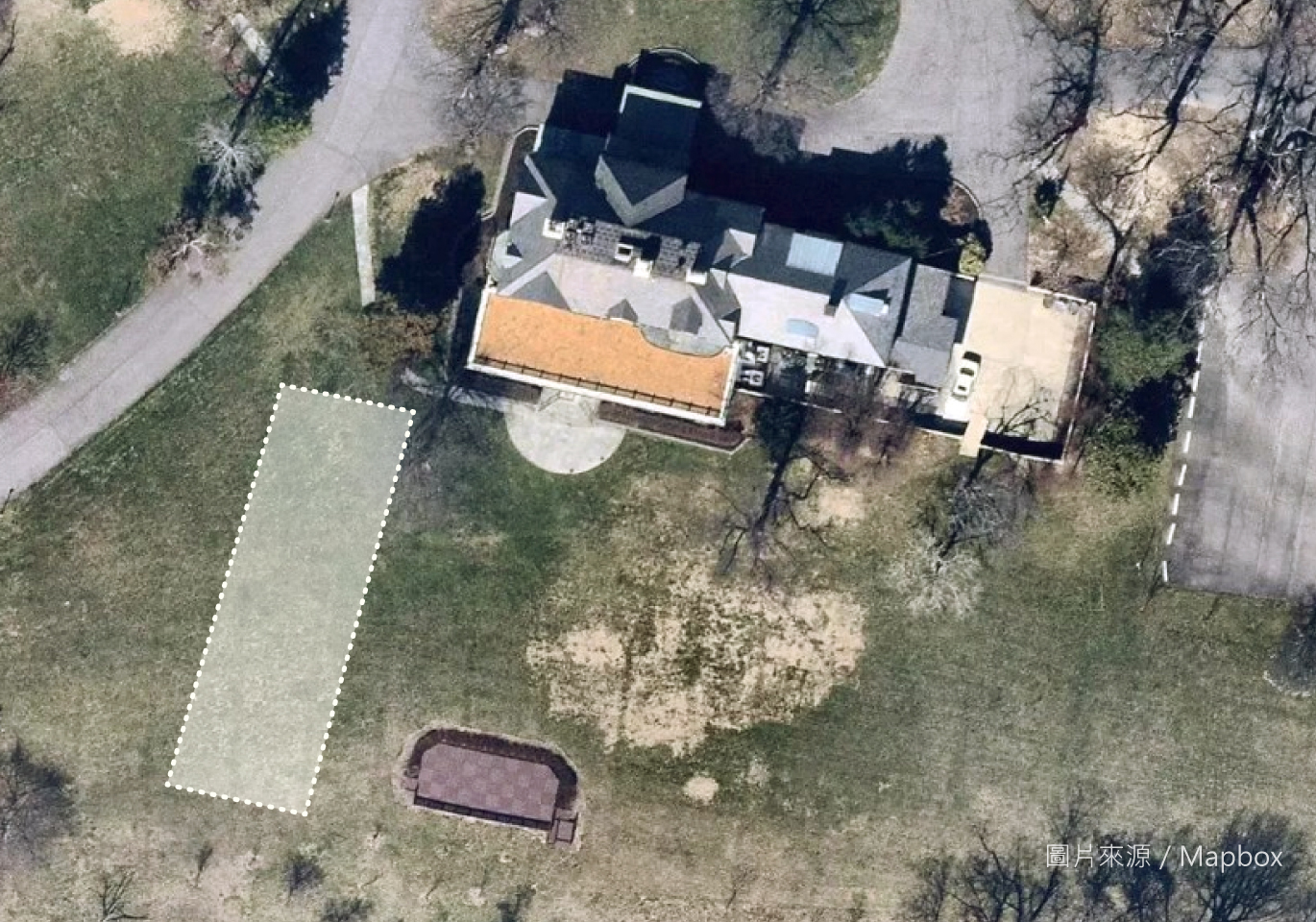 這是雙橡園的俯瞰圖,主建築周圍是草坪和大樹,前院有車道,後院是斜坡,環境清幽。2011年起,駐美代表處都在屋後大草坪舉辦國慶酒會。