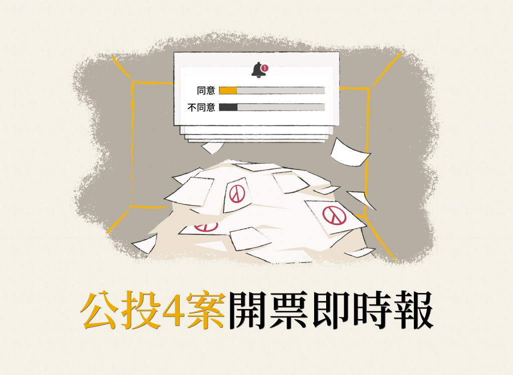 全國性公民投票案第17案至第20案(重啟核四、反萊豬、公投綁大選、三接遷離)12月18日投票,下午4時截止後立即開票,中央社串接中選會即時資料,不搶快、不灌票,提供你最準確的即時開票訊息。