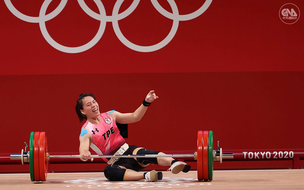 「舉重女神」郭婞淳參加東京奧運女子舉重59公斤級,替台灣摘下東奧首面金牌。儘管第3次挺舉挑戰141公斤世界紀錄失敗,郭婞淳跌坐地上,臉上仍露出燦爛笑容。中央社記者吳家昇攝 110年7月27日