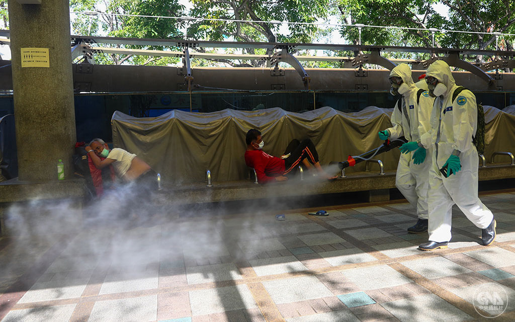 國軍化學兵頻繁地在龍山寺一帶進行大規模清消,生活在廣場的街友有人走避,有人淡定。也許經過那麼多次的消毒,原本最危險的重災區,也成了最安全的地方了吧。
