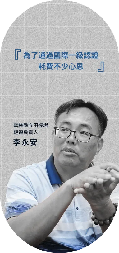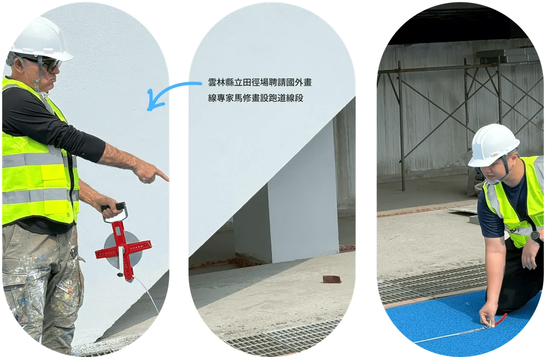 為了通過世界田徑總會一級認證,跑道寬度、起跑線、終點線等每條線段必須完美精準,以確保賽事的公平性。雲林田徑場跑道工程負責人李永安坦言,國內的畫線機具與施工人員的細心度仍不足,所以他們特別聘請國外專家協助畫線,「他們每畫一道線就會重新整理機器,畫出來的線不只精準還乾淨俐落」這點讓李永安深感佩服。