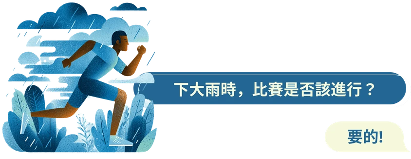 就運動賽事規範,在氣候未對選手造成實質威脅的情況下,如閃電、打雷、濃霧或是跑道嚴重積水等,運動員需照常出賽(如上方照片)。這並非不在意選手的安全與健康,而是延期的代價太大。