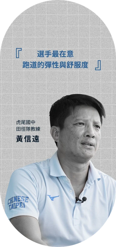 跑道經過排水測試後,還需確保賽道平整與彈性。虎尾國中田徑隊教練黃信遠分享,選手到新的比賽環境,會先下場跑一下、跳一下感受跑道的彈性回饋。雲林田徑場跑道採用PU顆粒,為了創造恰到好處的彈性,PU材質的厚度,需精準到公釐(mm)的調整。
