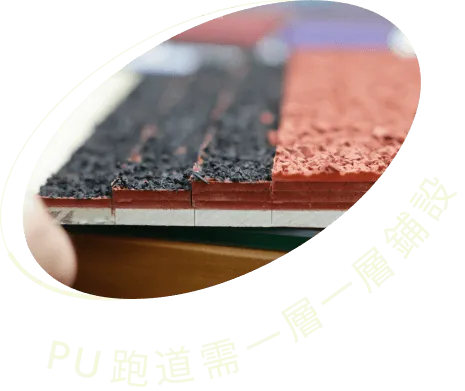 鋪在跑道最上層的PU是彈性來源,但跑道的平整需依靠下方的瀝青混泥土、瀝青透層、碎石、原土等材料,層層壓實避免凹凸不平。