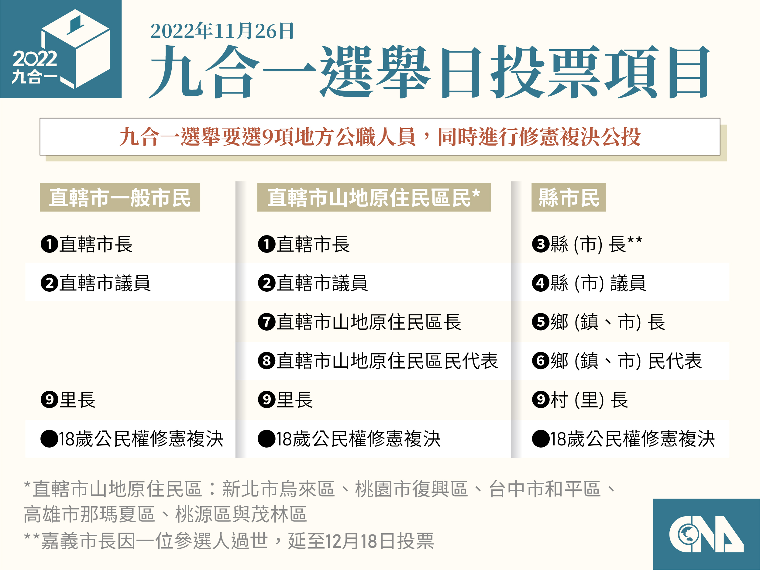 九合一選舉11月26日投開票,這場儼然成為台灣版「期中選舉」的大選,不但攸關地方執政權,更被視為2024年總統大選前哨戰。目前握有14席縣市長的國民黨期盼奪回台北市、桃園市等關鍵選區;民進黨在執政的7縣市則有輸不得的壓力,積極反攻雙北並尋求收復中台灣。首度挑戰全國性地方大選的民眾黨,也希望有所斬獲。
