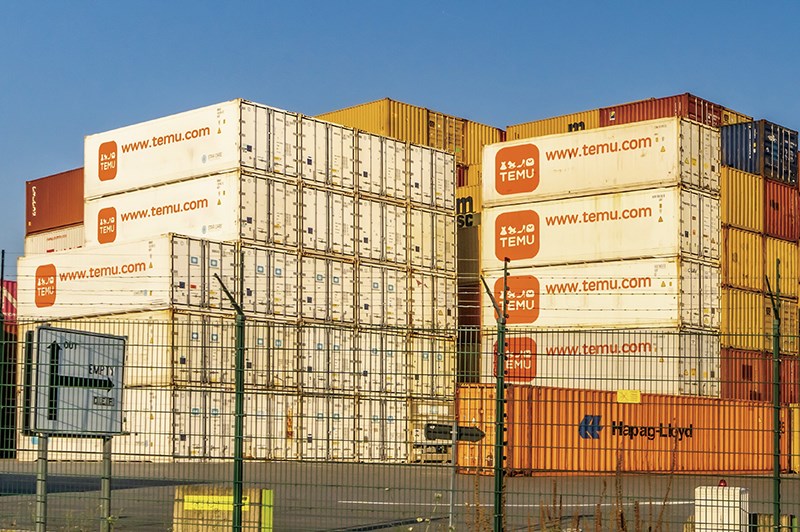 西方消費者透過跨境電商平台Temu就可以直接向中國製造商購買便宜商品。圖為比利時港口堆放大批Temu貨櫃。(Audio und werbung/Shutterstock.com)