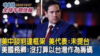 美中談判達貿易框架!美代表:未提台灣 美國務卿:沒打算以台灣作為籌碼|大軍壓境加碼威嚇!美派福特號航艦開赴加勒比海!川普將對委內瑞拉動武?|2025/10/27 中央社全球午間快報